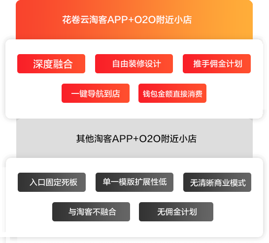 线上APP淘客用户与线下附近门店的无缝融合,线上领取优惠券的同时,自动匹配线下附近优惠商家拓展线下交易,形成线上线下生态闭环